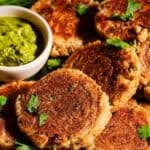 Enjoy with chutneys, or turn into Aloo Tikki Chaat with yogurt, tamarind chutney, onions, sev, and cilantro.