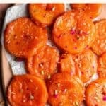 Serve apple jalebis on a large serving platter. Garnish it with chopped pistachios, edible dried rose petals, and a few additional strands of saffron.